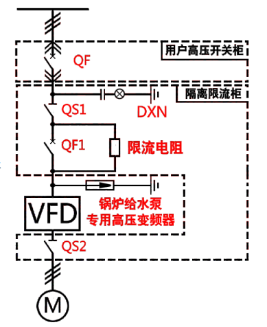 希望森蘭為鍋爐電動(dòng)給水泵拖動(dòng)系統電動(dòng)機配置的是給水泵專(zhuān)用變頻調速系統。系統針對鍋爐給水泵運行的特點(diǎn)和要求設計,完全符合鍋爐給水泵的運行特點(diǎn)。系統一次主回路方案選取一拖一帶限流柜方案,滿(mǎn)足系統穩定運行要求的同時(shí)消除了高壓上電時(shí)對系統的沖擊。
