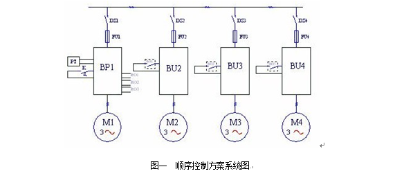 由于城市自來(lái)水的用量隨季節的變化而變化,隨每日時(shí)段不同而變化。為使供水的水壓恒定,最常見(jiàn)的辦法是采用變頻恒壓供水系統,即壓力變送器裝在主管網(wǎng)上檢測管網(wǎng)壓力信號,再將此壓力信號送到變頻器(PLC)的模擬信號輸入端口,由此構成壓力閉環(huán)控制系統,管網(wǎng)壓力的恒定依賴(lài)變頻器的調節控制。對于多泵情況,可以?xún)煞N不同的控制系統方案,一種是“順序控制方案”,系統圖如圖一所示: