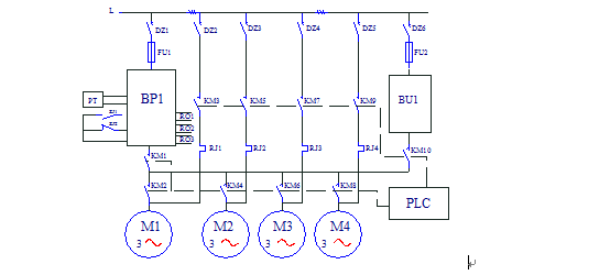 圖中:BP1—變頻器;BU2~BU4--軟起動(dòng)器,PT—壓力變送器。由圖一可見(jiàn),變頻器連接在第一臺水泵電機上,需要加泵或減泵時(shí),由變頻器RO1~RO3端口輸出信號起動(dòng)或停止其他的水泵,這時(shí)水泵的起動(dòng)采用自耦降壓起動(dòng)裝置或軟起動(dòng)器。這種方案的特點(diǎn)是水泵電機不需要在變頻和工頻之間切換;第一臺水泵永遠連接在變頻器上,沒(méi)有切換過(guò)程中的失壓現象;由于變頻泵以外的泵都有軟起動(dòng)器,所以不需要再做備用系統,當變頻器故障時(shí),可用軟起動(dòng)器手動(dòng)起動(dòng)M2~M4水泵,保證供水不致中斷;每臺電機都有起動(dòng)器,初始投資較大。另一種是“循環(huán)投切”方案,系統圖如圖二所示