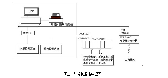 為保證系統的可靠性,上位機PC用于管理,用組態(tài)軟件做出若干工藝流程圖,實(shí)時(shí)顯示系統的運行狀況,并統計歷史數據,如需要可隨時(shí)打印報表;還用于故障的報警和處理。PC機為研華工業(yè)計算機,PLC為西門(mén)子S-7300,便于與總控室計算機聯(lián)網(wǎng),采用帶有PROFIBUS接口的CPU315。CP5611是通信模塊,PDM-820AC電參數綜合分析儀用于檢測系統的用電量??刂扑玫钠?停,切換,閥的啟/閉;電機電流,溫度的檢測,水泵使用時(shí)間的統計;壓力,流量,水質(zhì)參數的采集等,均由PLC完成。水壓的給定值由變頻器鍵盤(pán)設定。