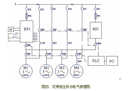 圖中:BP1—變頻器,BU1—軟啟動(dòng)器,PT-壓力變送器,ZJ1、ZJ2-用于控制系統的起動(dòng)/停止和自動(dòng)/手動(dòng)轉換。由圖二可見(jiàn),變頻器連接在第一臺水泵電機上,需要加泵時(shí),變頻器停止運行,并由變頻器的輸出端口RO1~RO3輸出信號到PLC,由PLC控制切換過(guò)程。切換開(kāi)始時(shí),變頻器停止輸出(變頻器設置為自由停車(chē)),利用水泵的慣性將第一臺水泵切換到工頻運行,變頻器連接到第二臺水泵上起動(dòng)并運行,照此,將第二臺水泵切換到工頻運行,變頻器連接到第三臺水泵上起動(dòng)并運行;需要減泵時(shí),系統將第一臺水泵停止,第二臺水泵停止,這時(shí),變頻器連接在第三臺水泵上。再需要加泵時(shí),切換從第三臺水泵開(kāi)始循環(huán)。這種方式保證永遠有一臺水泵在變頻運行,四臺水泵中的任一臺都可能變頻運行。這樣,才能做到不論用水量如何改變都可保持管網(wǎng)壓力基本恒定,且各臺水泵運行的時(shí)間基本相同,給維護和檢修帶來(lái)方便,所以,大部分的供水廠(chǎng)家都鐘情于循環(huán)投切方案。但此方案也有不足之處,就是在只有一臺變頻器運行并切換到工頻過(guò)程中會(huì )造成管網(wǎng)短時(shí)失壓,在設計時(shí)應充分的引起重視。另外,必須設置一套備用系統,圖中的軟啟動(dòng)器就是作為備用。當變頻器或PLC故障時(shí),可用軟起動(dòng)器手動(dòng)輪流起動(dòng)各泵運行供水。