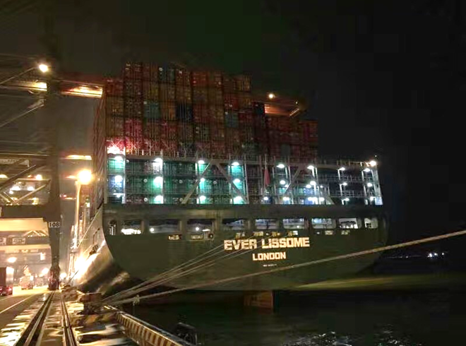 隨后EVER LISSOME LONNON號船上工作人員開(kāi)始放船用連接高壓電纜,岸上工作人員將高壓電纜連接到港口#14泊位區岸電接線(xiàn)箱,EVER LISSOME LONNON具有連接岸電條件。